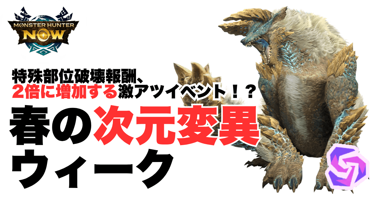 | 大量出現 ★8 次元変異ジンオウガ 4月3日(金)18:00 – 18:59 4月4日(土)13:00 – 13:59 4月5日(日)13:00 – 13:59 | |