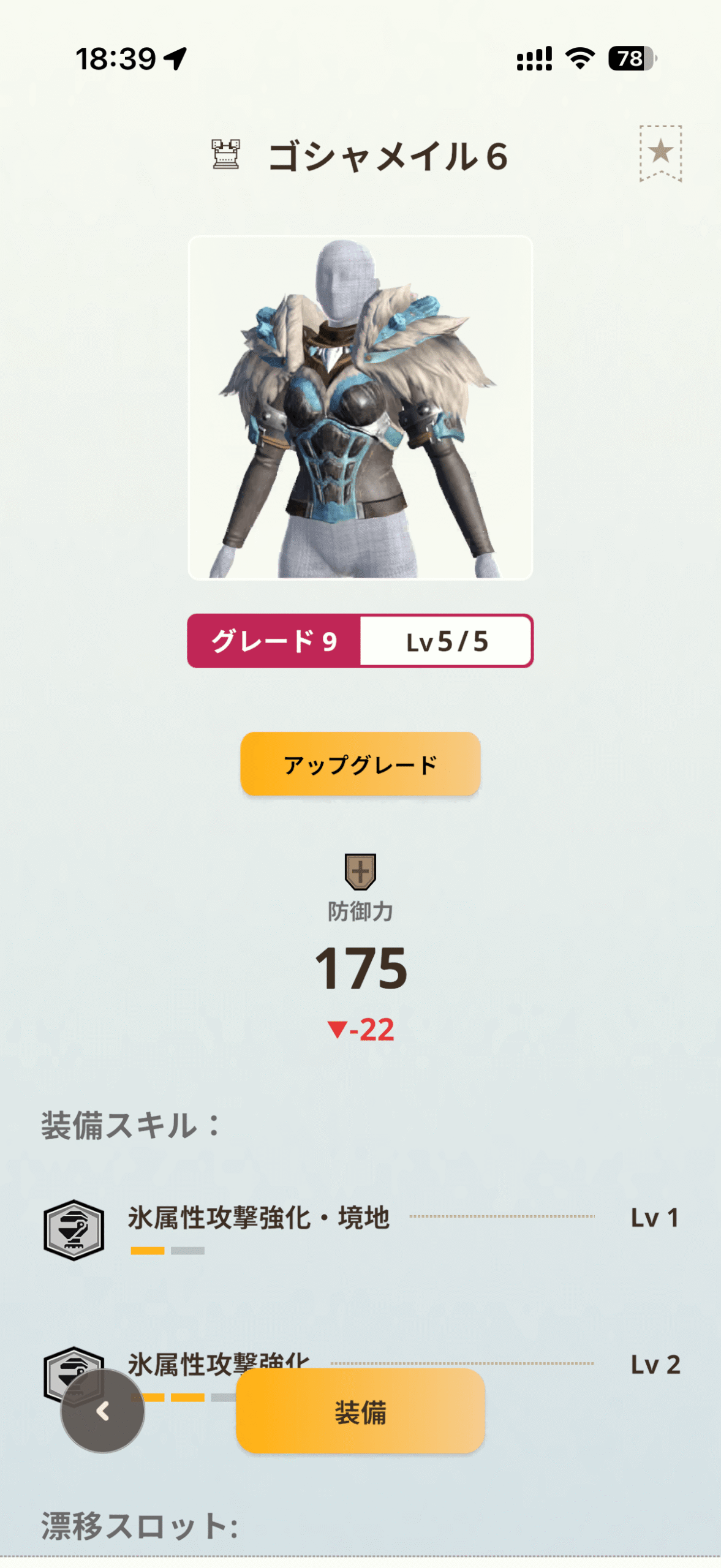 候補として挙がるのはレイギエナ腰とウルクスス脚の2つで、どちらも氷属性攻撃強化Lv2が付与されています。ここに漂移錬成を1枠追加することで、氷属性攻撃強化・境地Lv2を発動可能です。