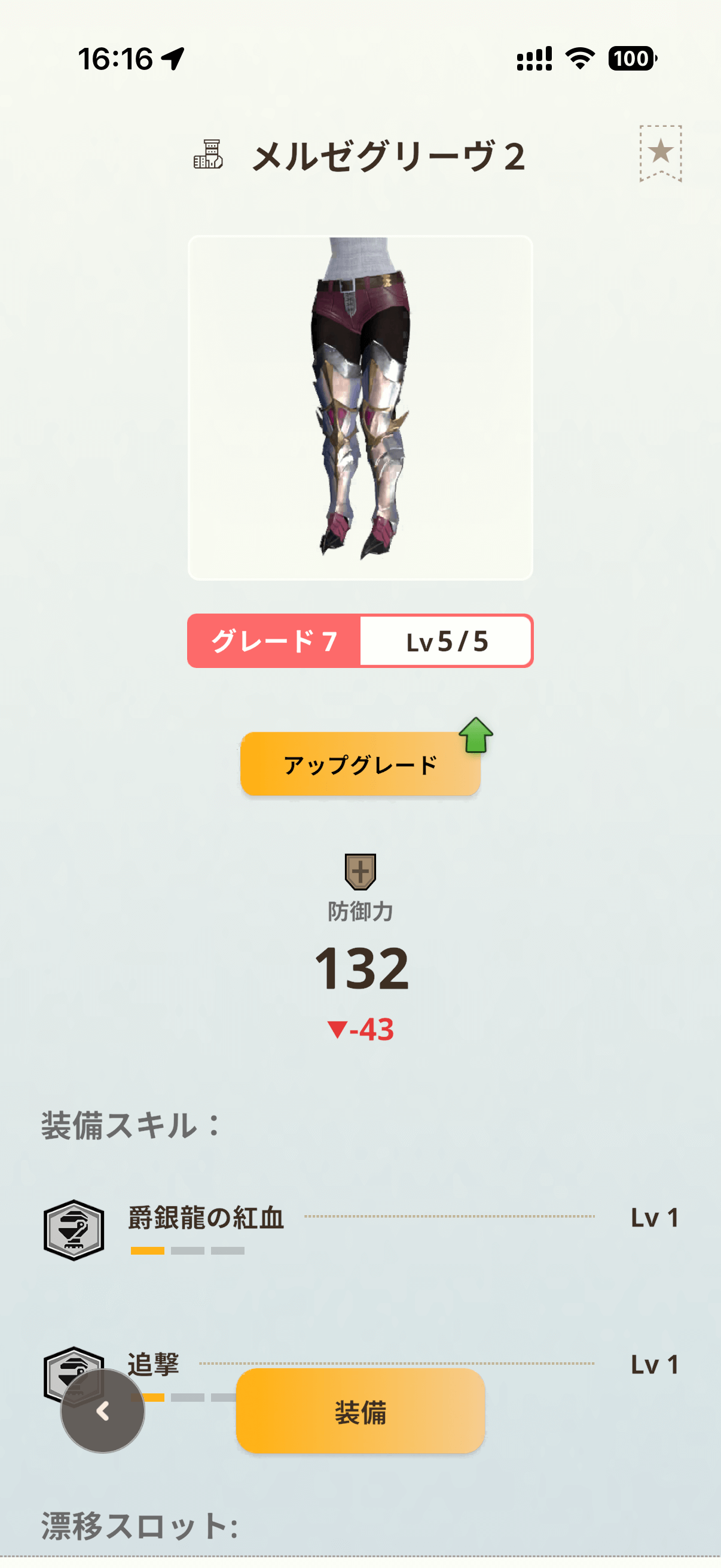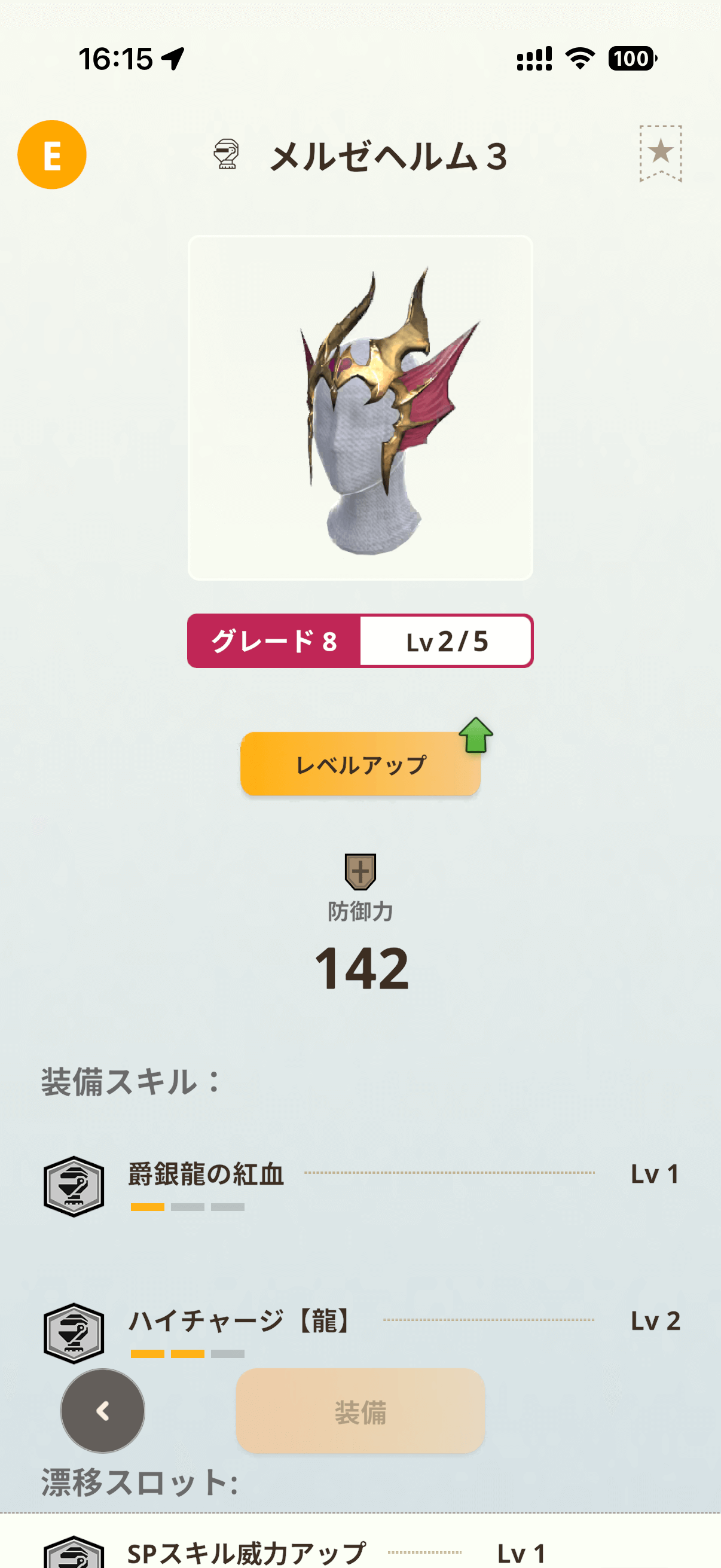 メル・ゼナの片手剣には「狩人の結束Lv1」と、新たに追加された「ハイチャージ【龍】Lv1」が付与されています。