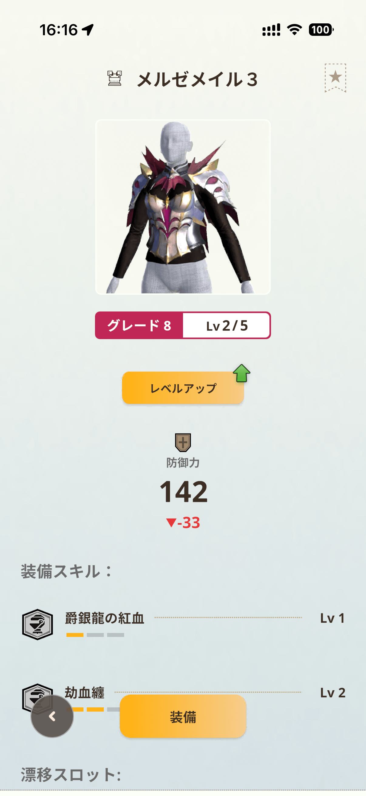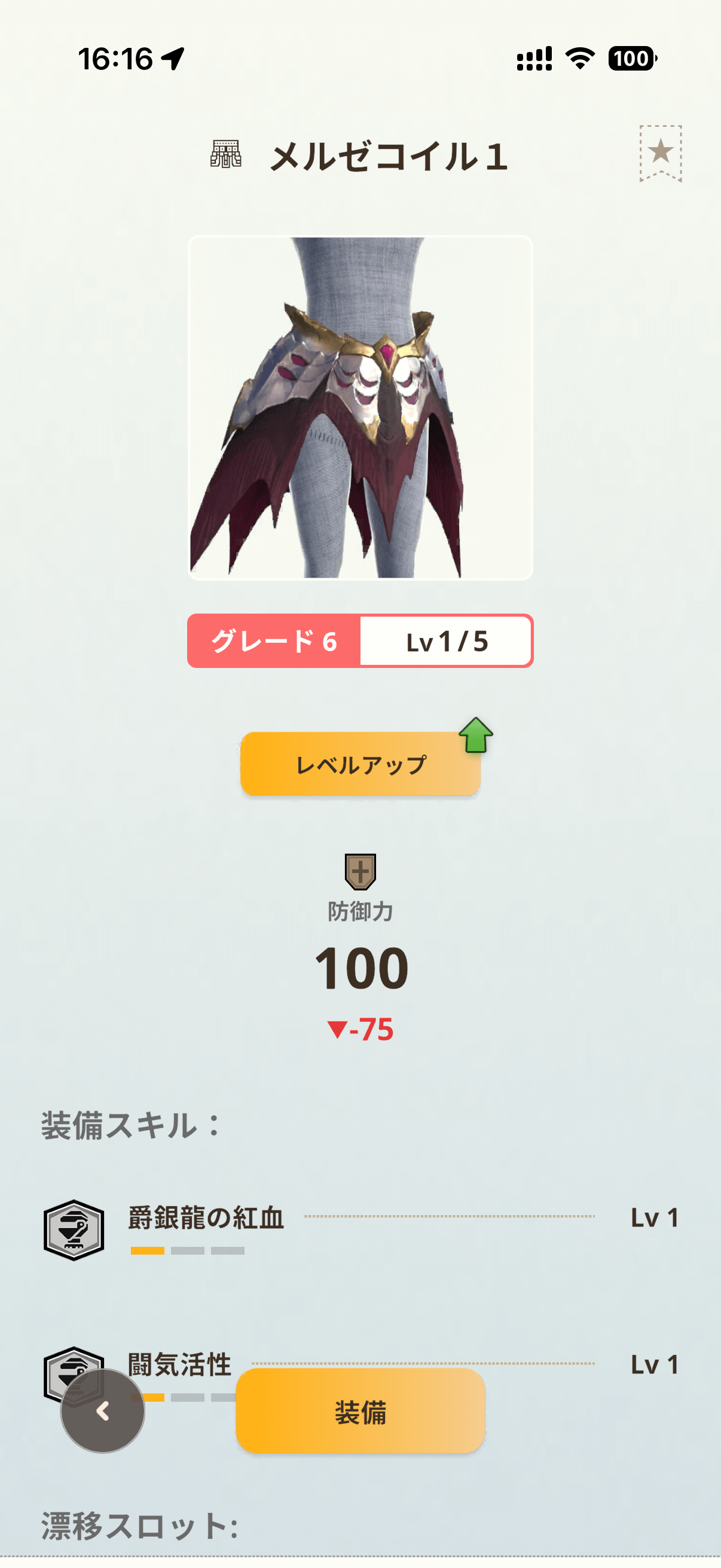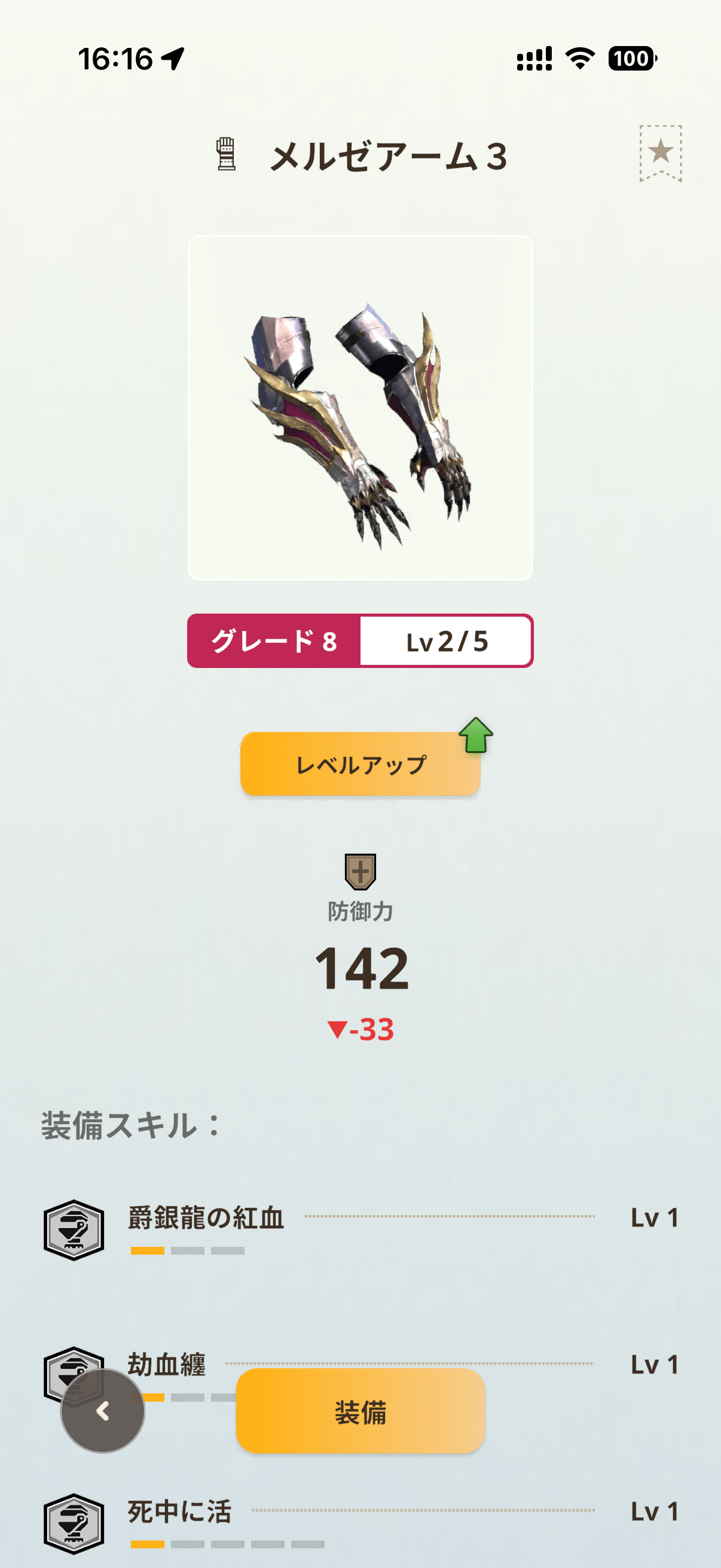 固有スキル「爵銀龍の紅血」Lv3は、龍属性モンスターから受けるダメージを10%軽減し、与える龍属性攻撃力を25%上昇。龍属性片手剣を使う際の恩恵は非常に大きく、攻守の両面で火力を支えてくれます。