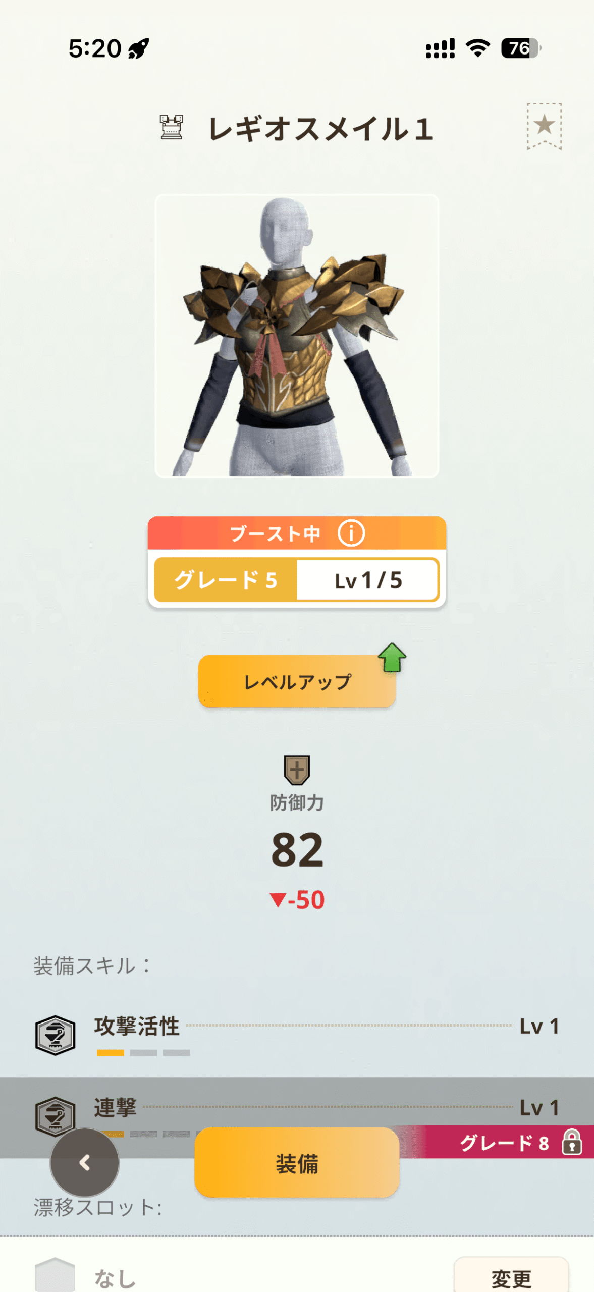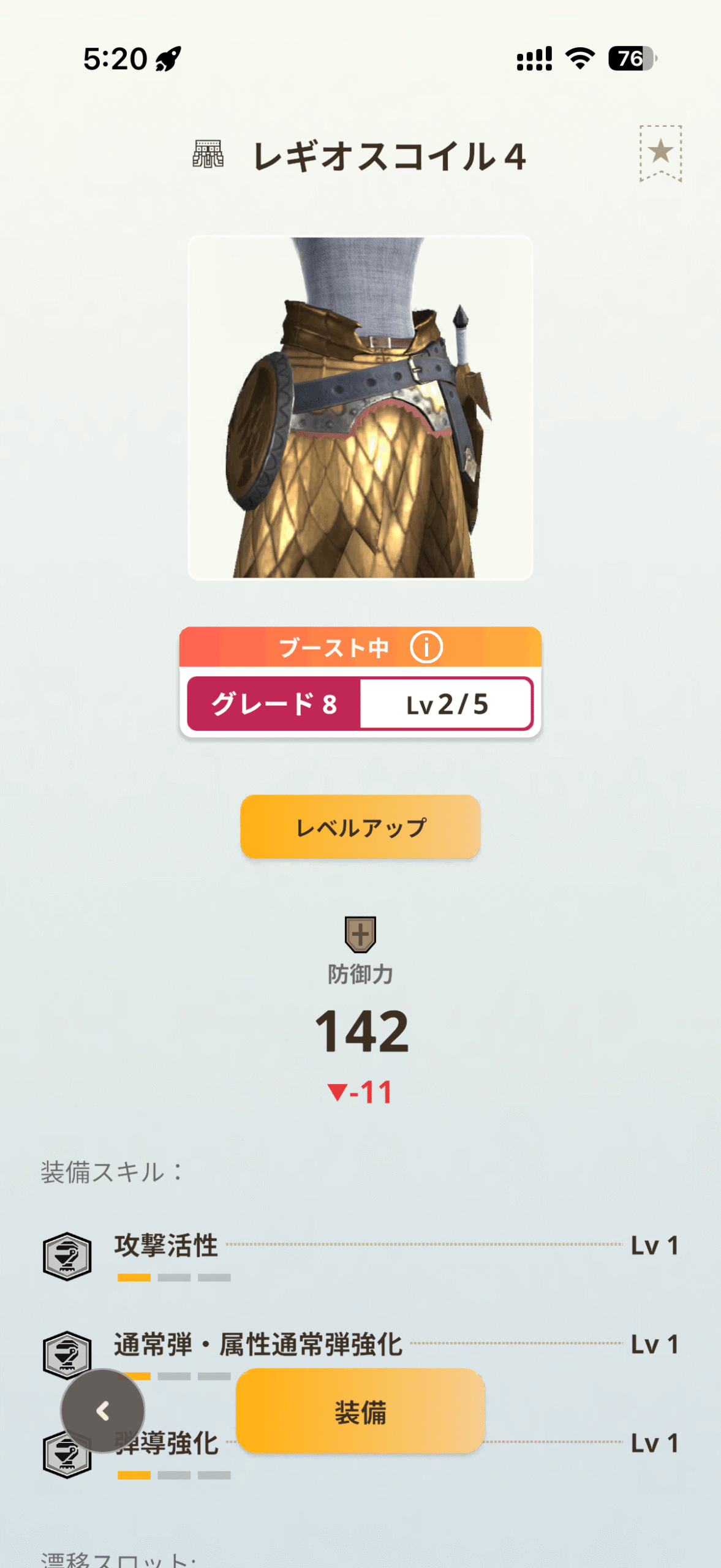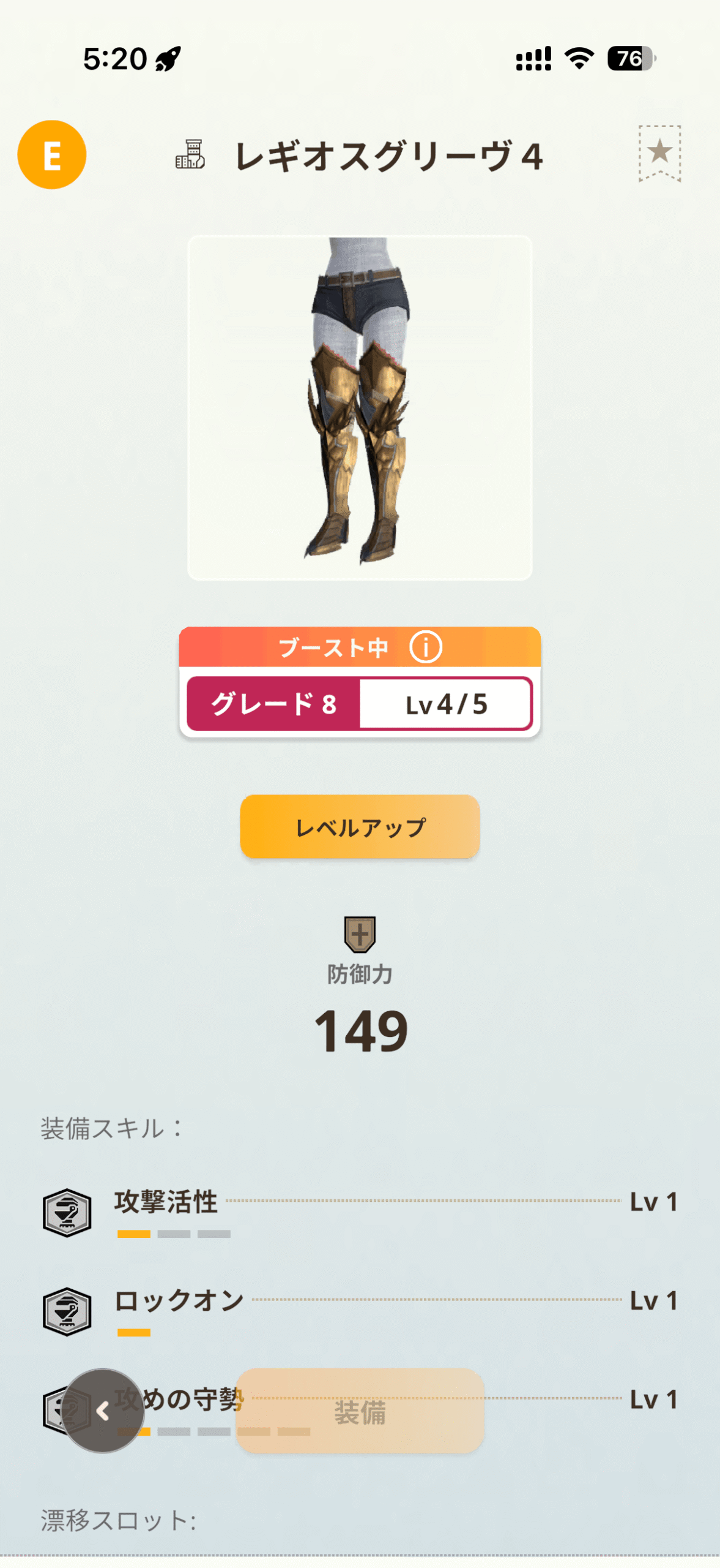 脚装備は、「攻撃活性Lv1」「ロックオンLv1」「攻めの守勢Lv1」が付与された防具です。